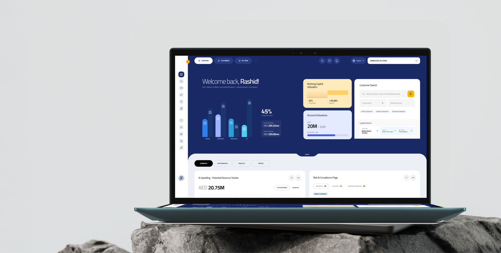 We studied RM workflows, mapped end-to-end journeys, and benchmarked against modern banking platforms. From these insights, we designed a landing page, dashboards, and customer management screens that prioritize clarity, efficiency, and role-specific actions.