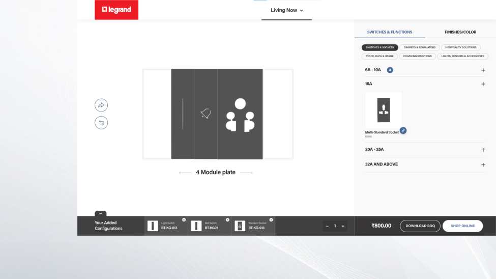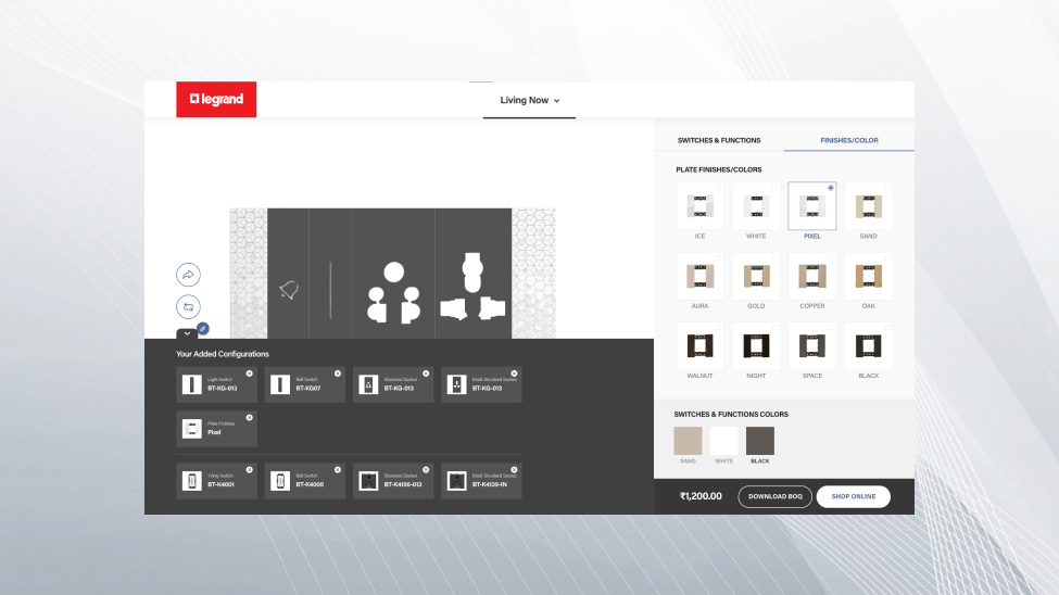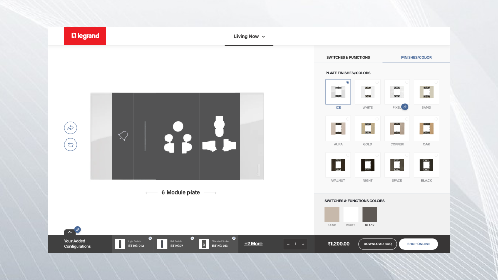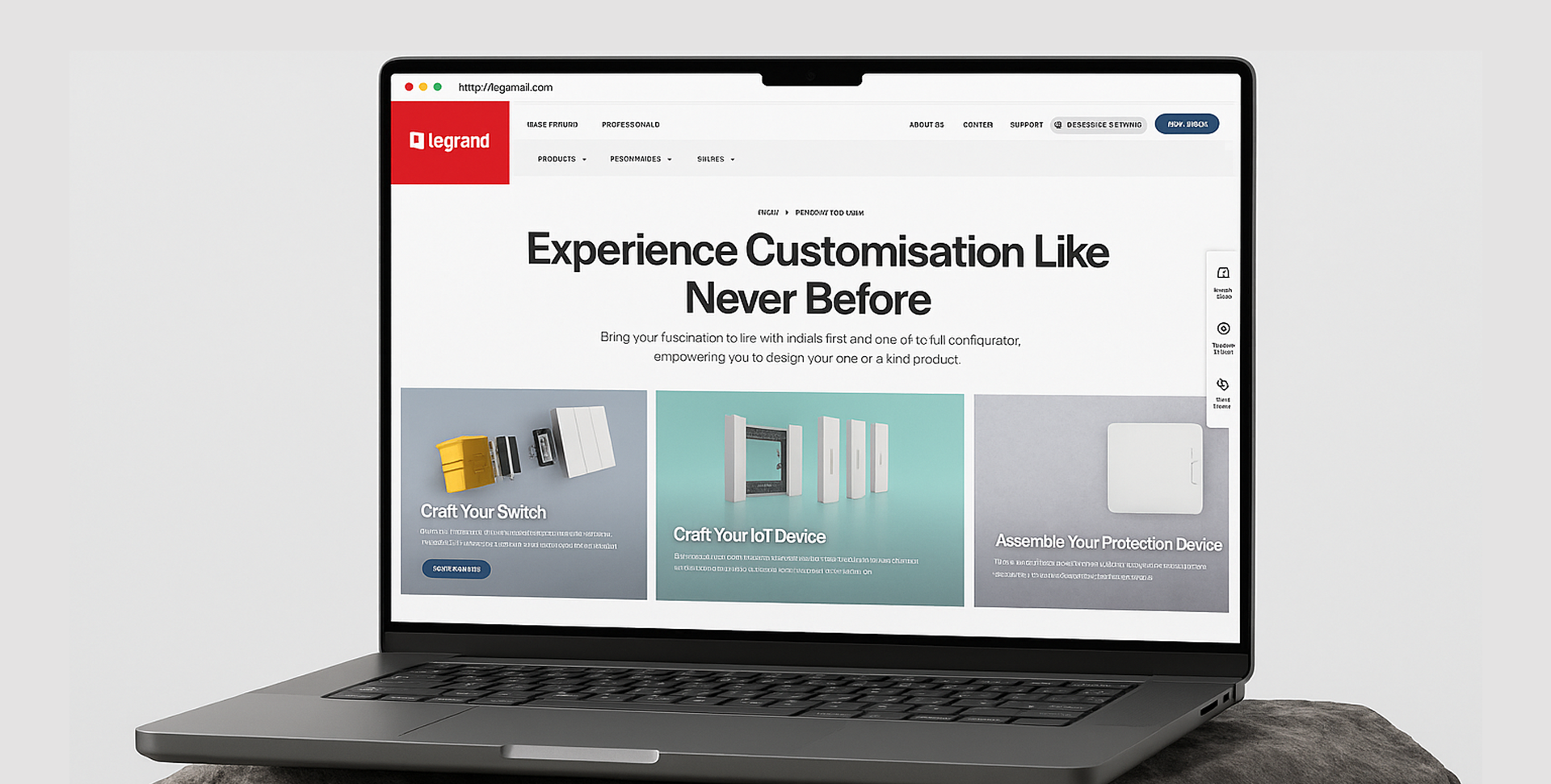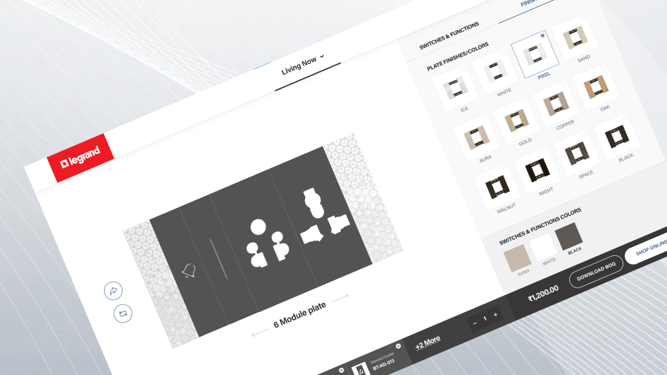 Legrand India collaborated with EvolutionCo to make product customization more accessible and interactive for customers by developing a DIY Configurator. This tool allows users to tailor electrical switches to their preferences by selecting and combining components while receiving real-time visual feedback.