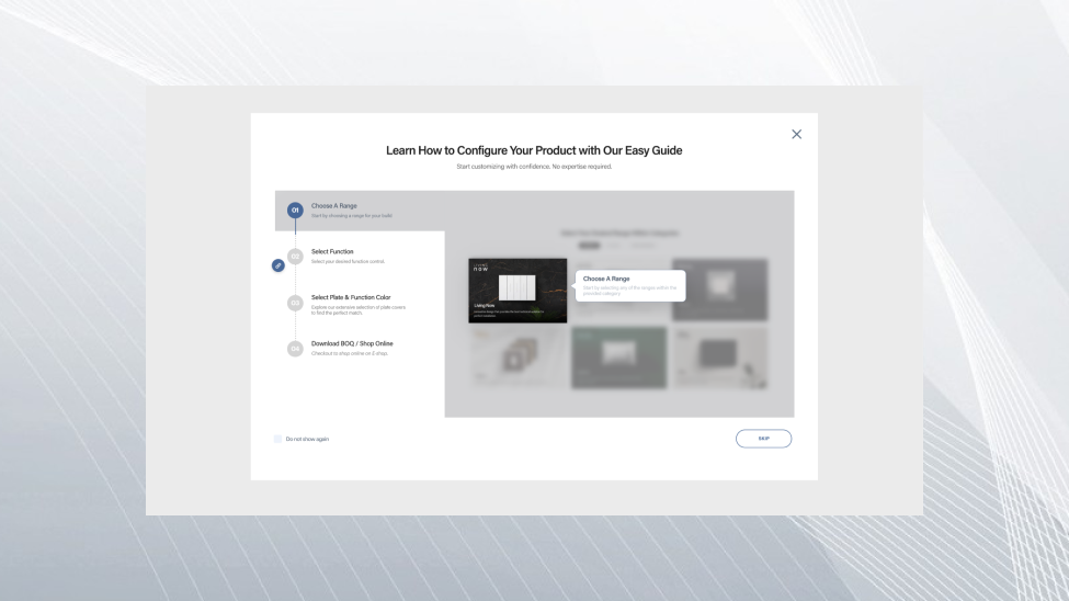 Built a step-by-step wizard combining dynamic selection, real-time previews, and guided recommendations. Integrated BOQ generation with save/share and eShop linkage. Optimised asset handling, performance, and UX to reduce choice overload and improve configuration completion rates.