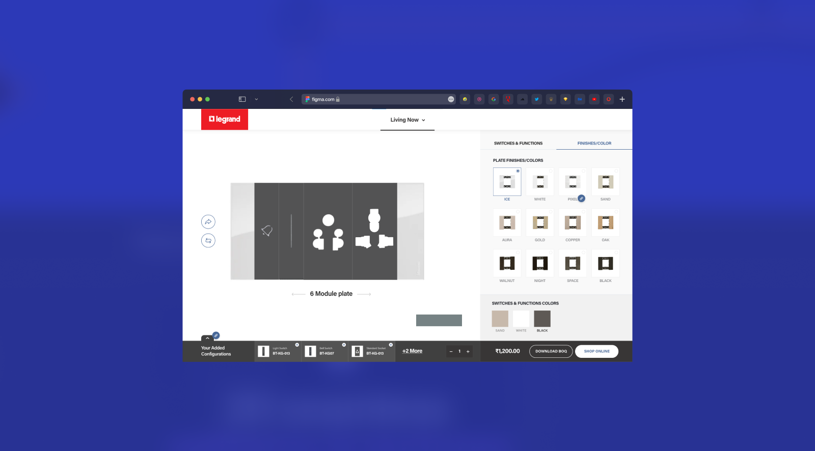 Developed a modular UI kit aligning with Legrand’s brand: componentized switch renderers, finish swatches, hotspot interactions, and compact toolbars for mobile. Visual rules ensured clarity across previews, thumbnails, and product cards for a cohesive, premium experience.
